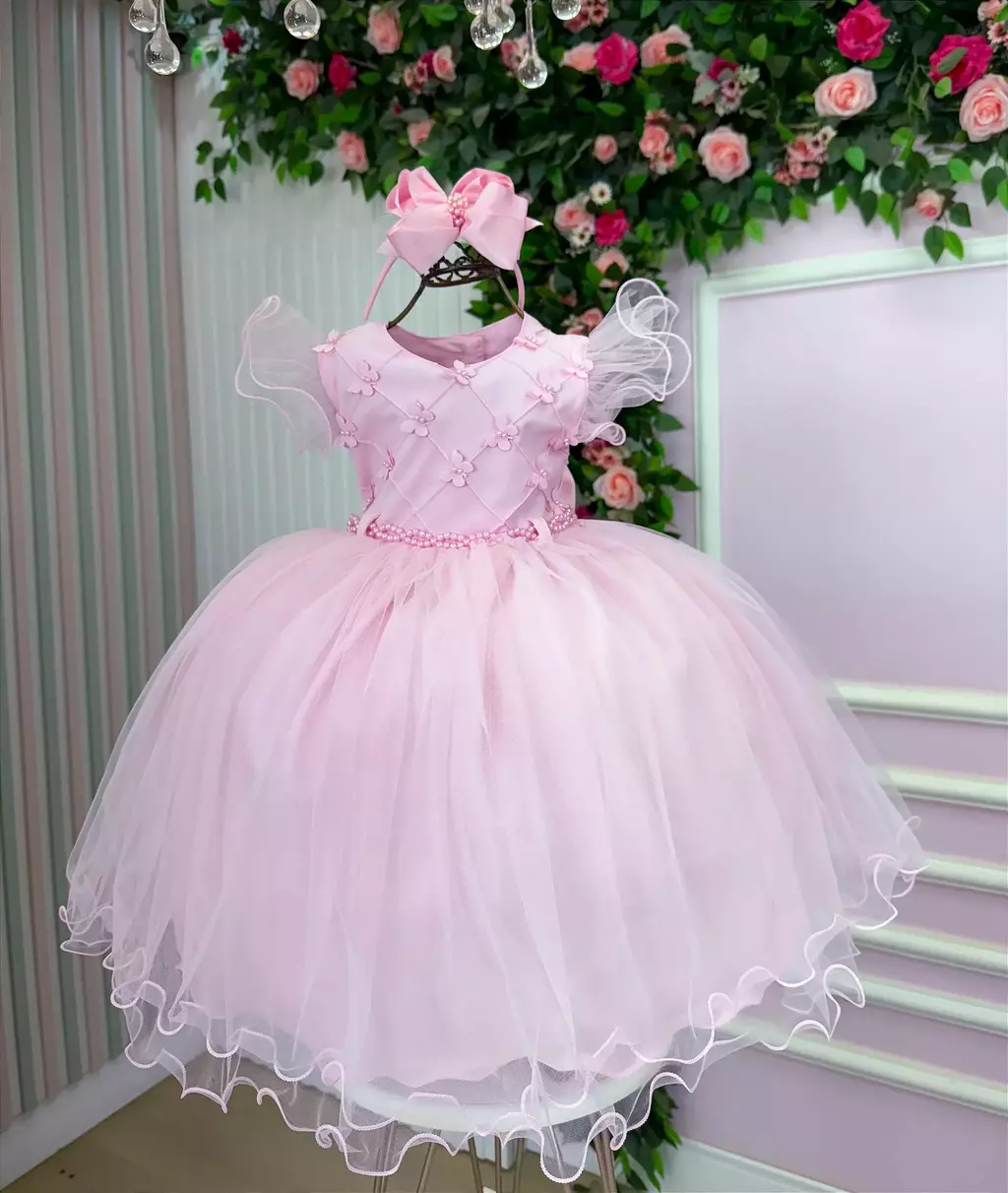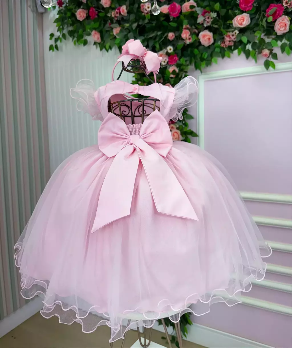 Confeccionado em tecido misto possui forro em poliéster e algodão para não incomodar a criança e proporcionando um caimento incrível e sofisticado, possui gola redonda, comprimento médio, mangas curtas, possui elástico nas costas para melhor ajuste, acabamento com lindo laço na parte posterior do vestido completa o look dos sonhos!